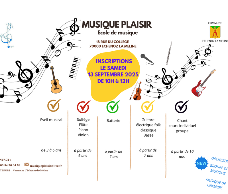 Musique Plaisir fait sa rentrée le samedi 13 septembre 2025, à partir de 10 heures, à l'école de musique, située au 18 rue du collège, ECHENOZ LA MELINE.